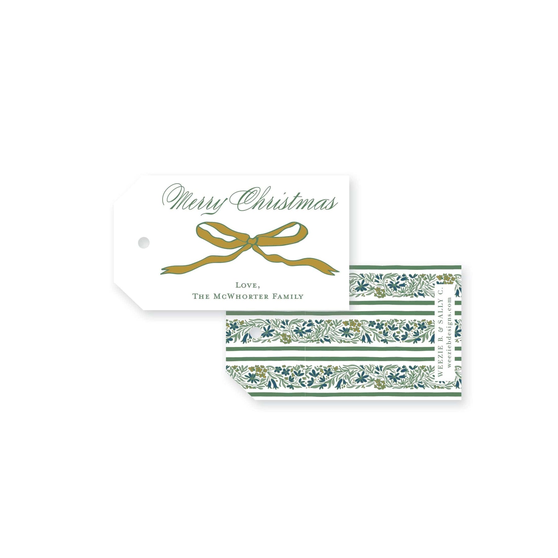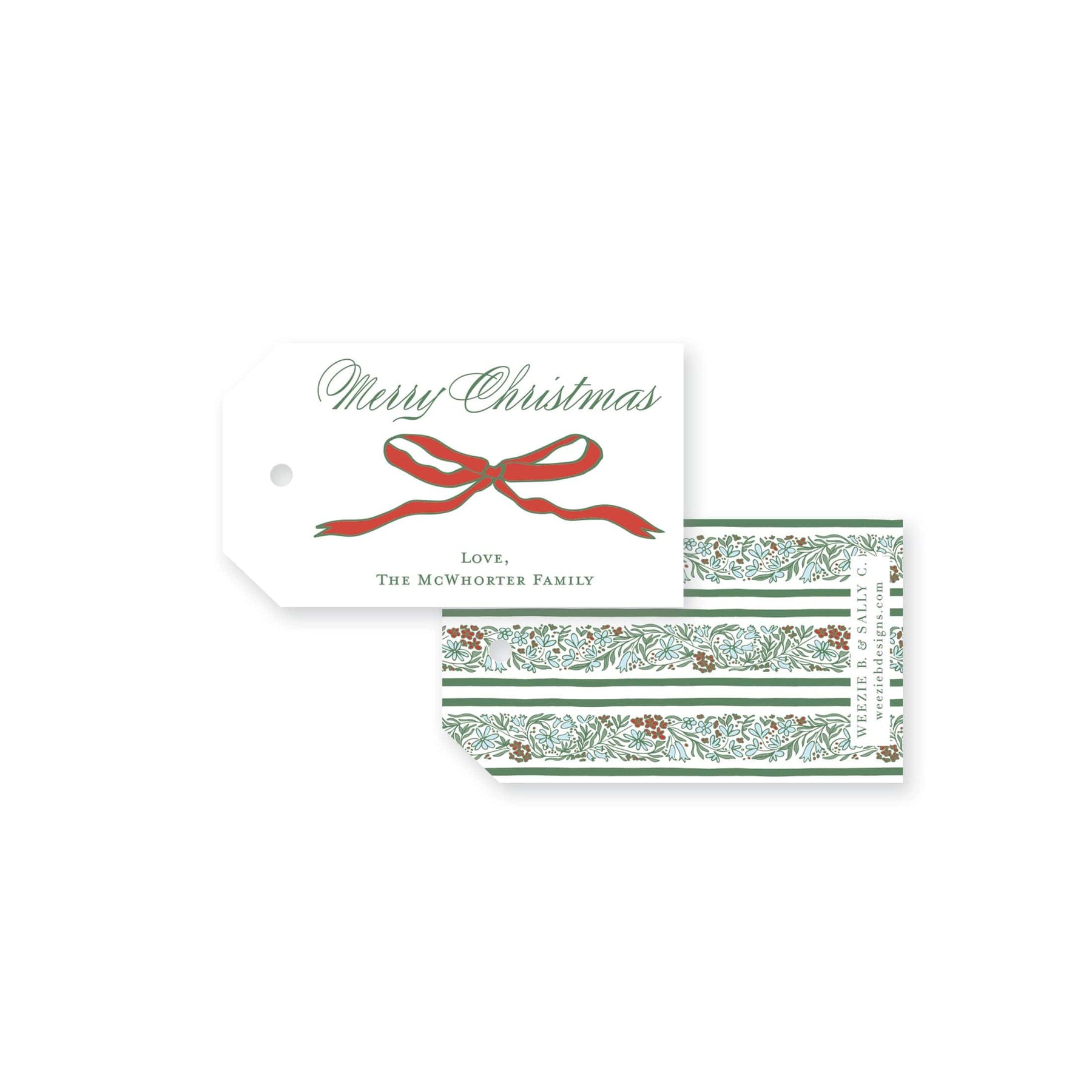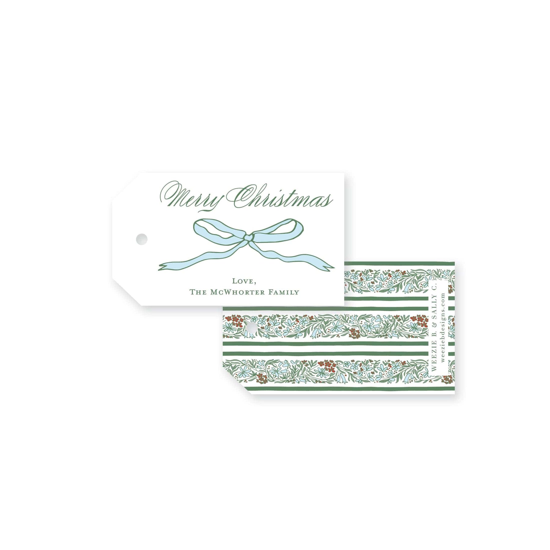 Whimsy Bow Christmas Gift Tags and are personalized for you with our gorgeous hand-sketched ribbons and bows. Choose from 4 colors, red, light blue, gold or dark blue.