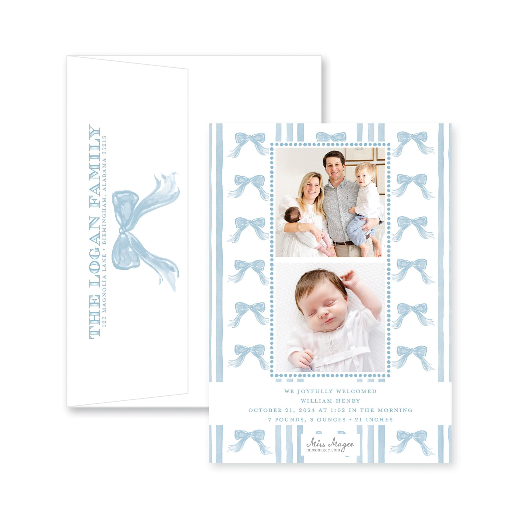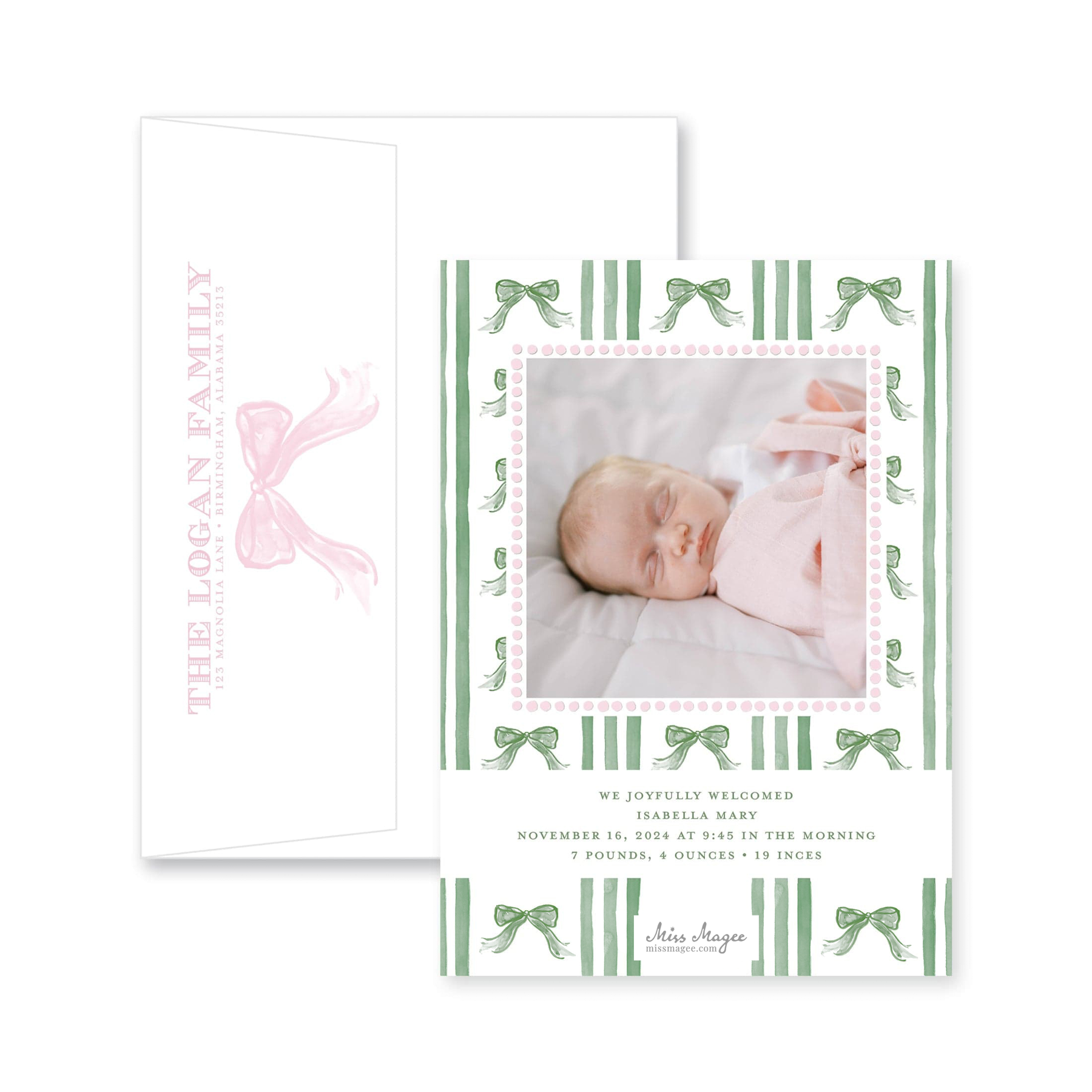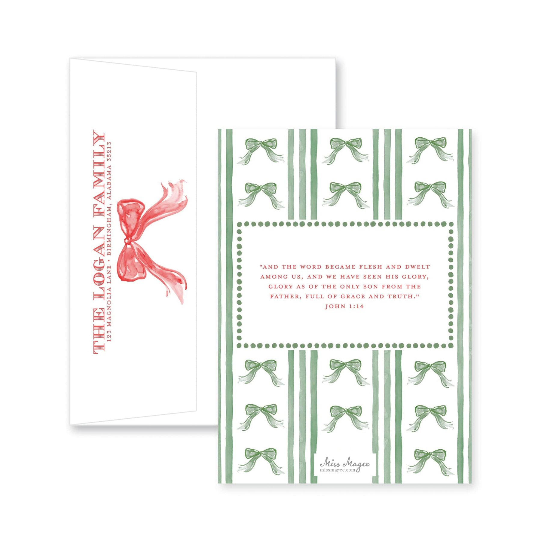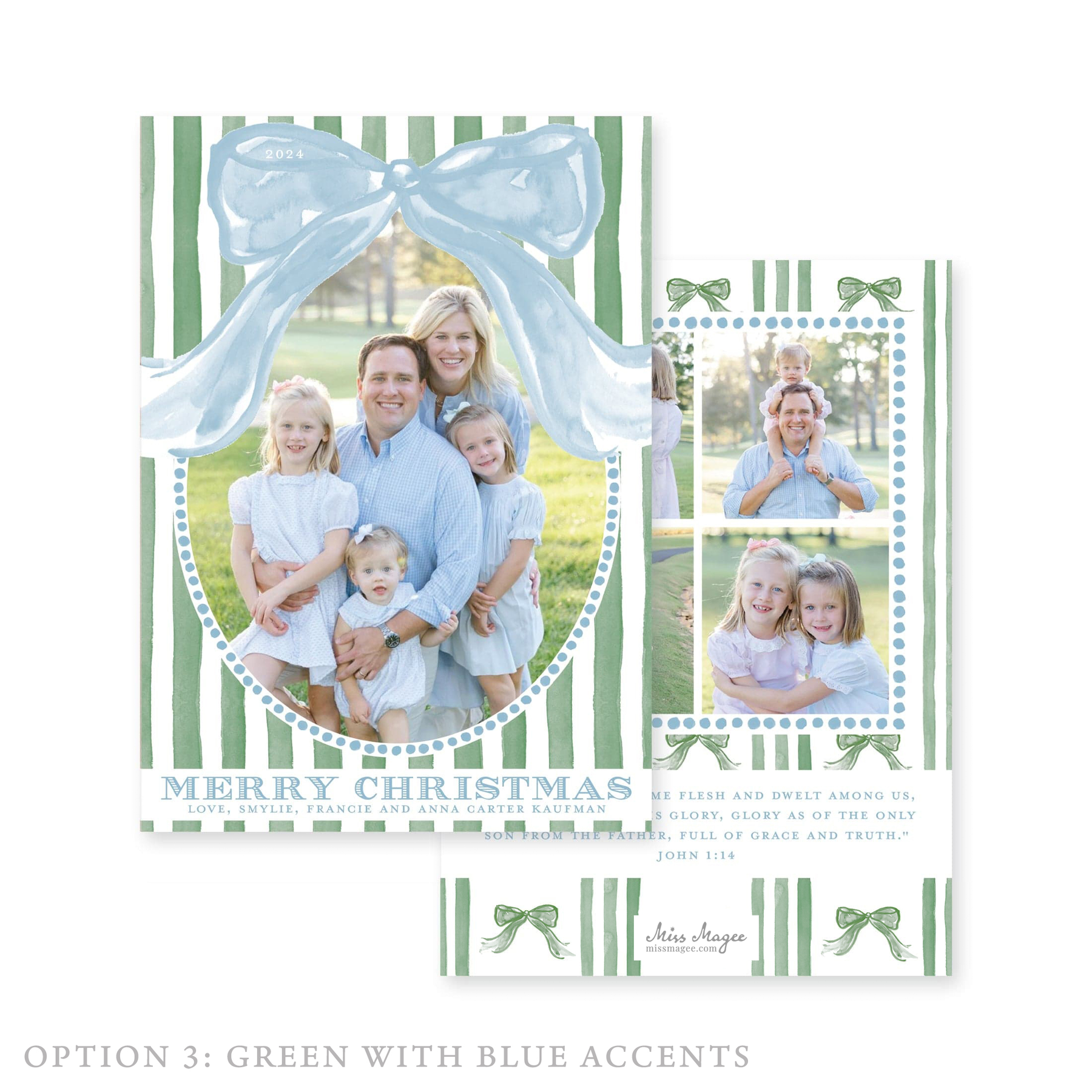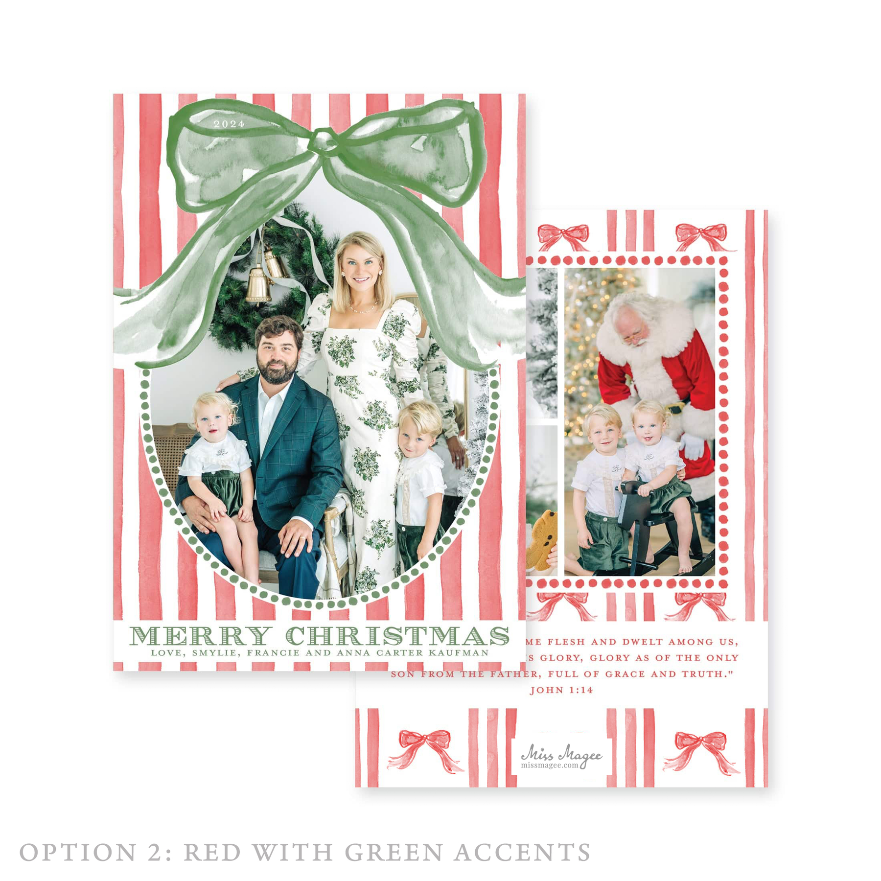 Giant Bow  Christmas Card features your photo on the front framed underneath a watercolored bow and encircled with watercolor dots and stripes!! This card has nearly endless color combinations to suite you and your family photos!