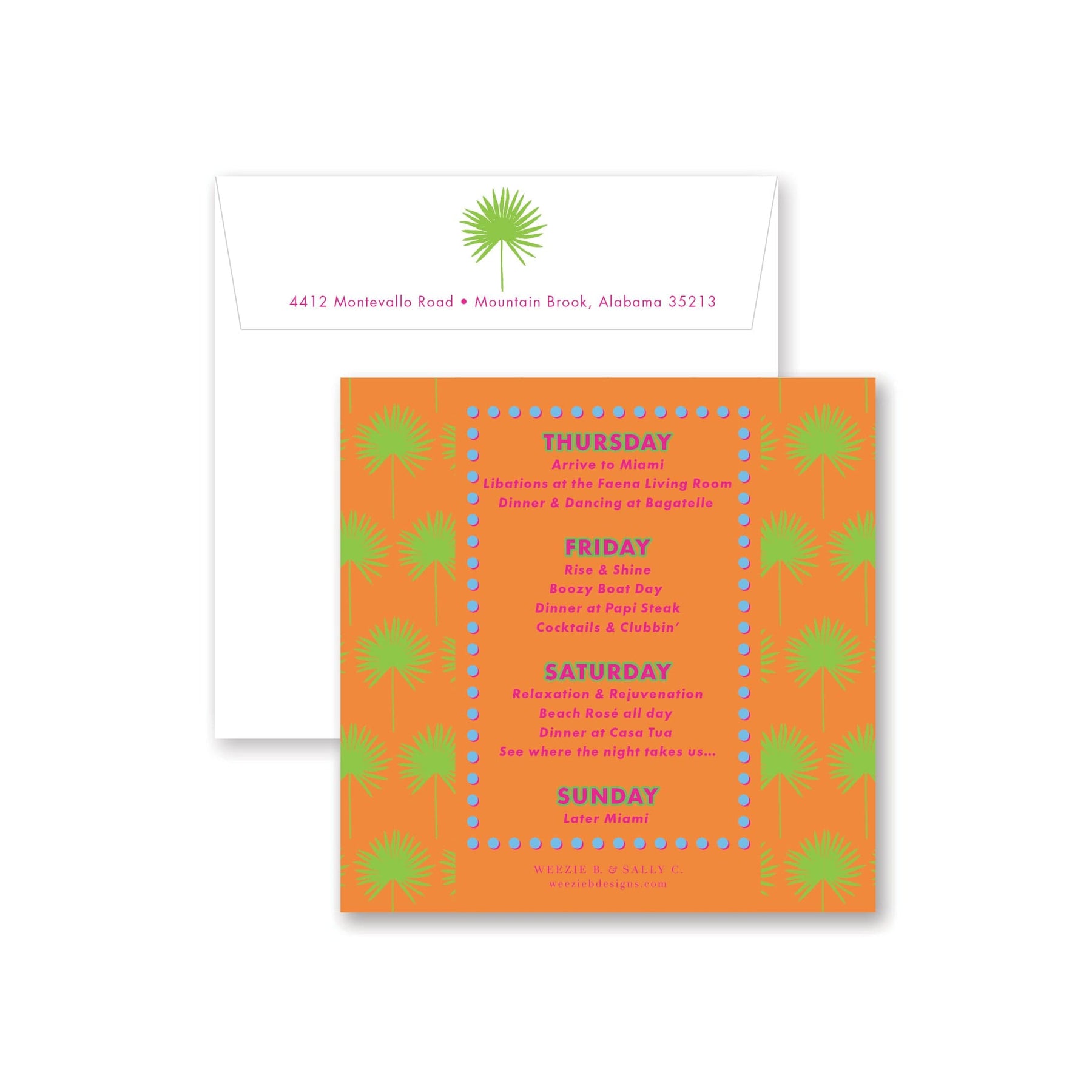 Itineraries on the back are an extra $10. If you opt out of adding an itinerary, your invitation will still have palm pattern printed on the back, as well as the Weezie B. Designs logo.