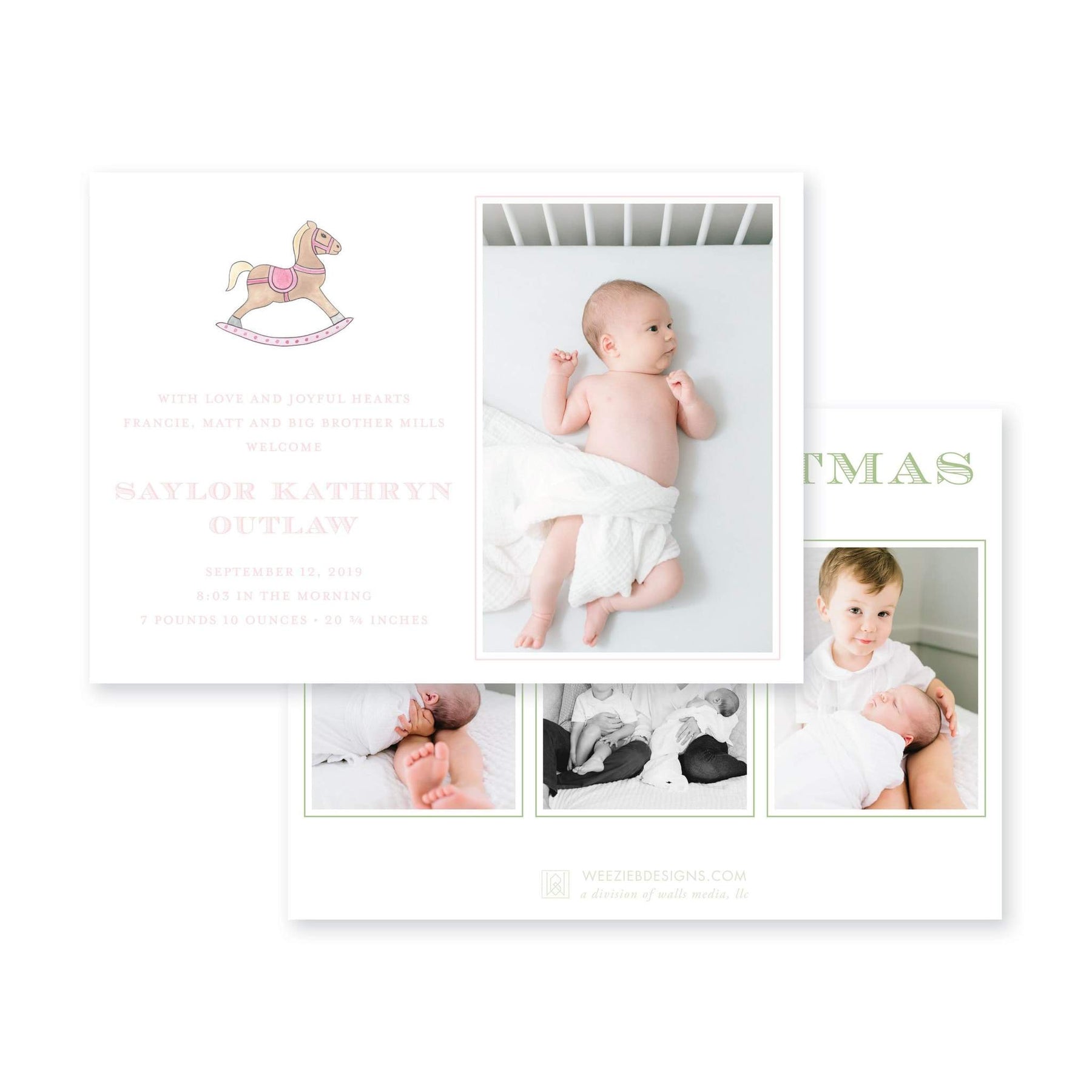 Rocking Horse Combination Birth Announcement Christmas Card is the perfect birth announcement to send to your friends and family during the Christmas season. This features your photo on the front along with your little ones birth information.