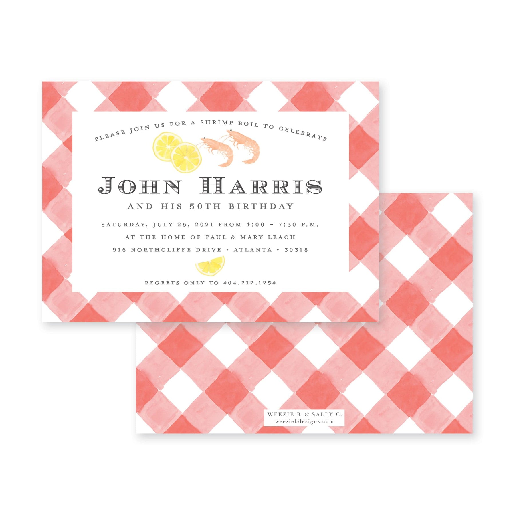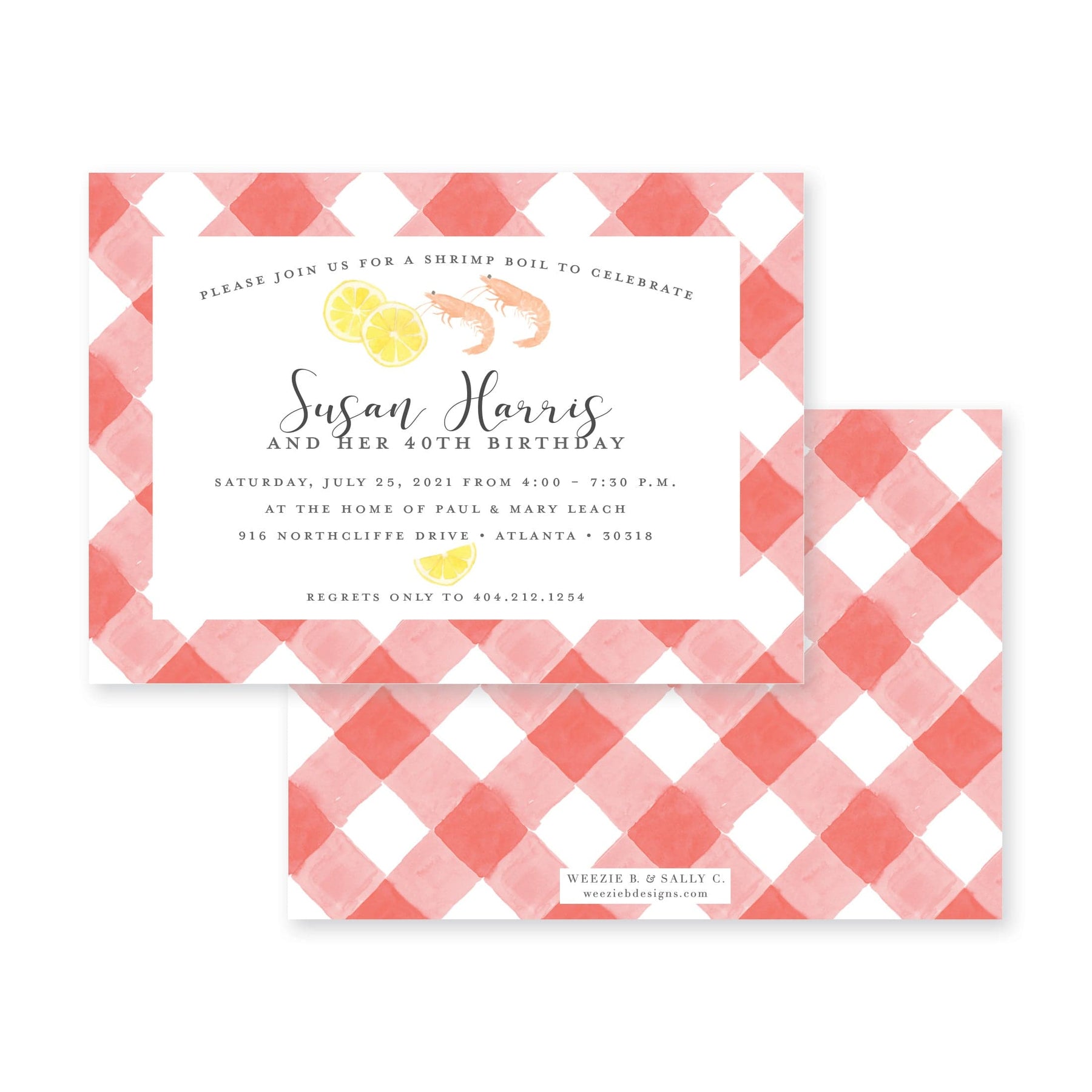 Are you hosting a shrimp boil for the a birthday or just for fun? Our Shrimp Boil Birthday Invitation will work great for your celebration! It would also be cute for a Rehearsal Dinner, or any type of country or seafood boil!