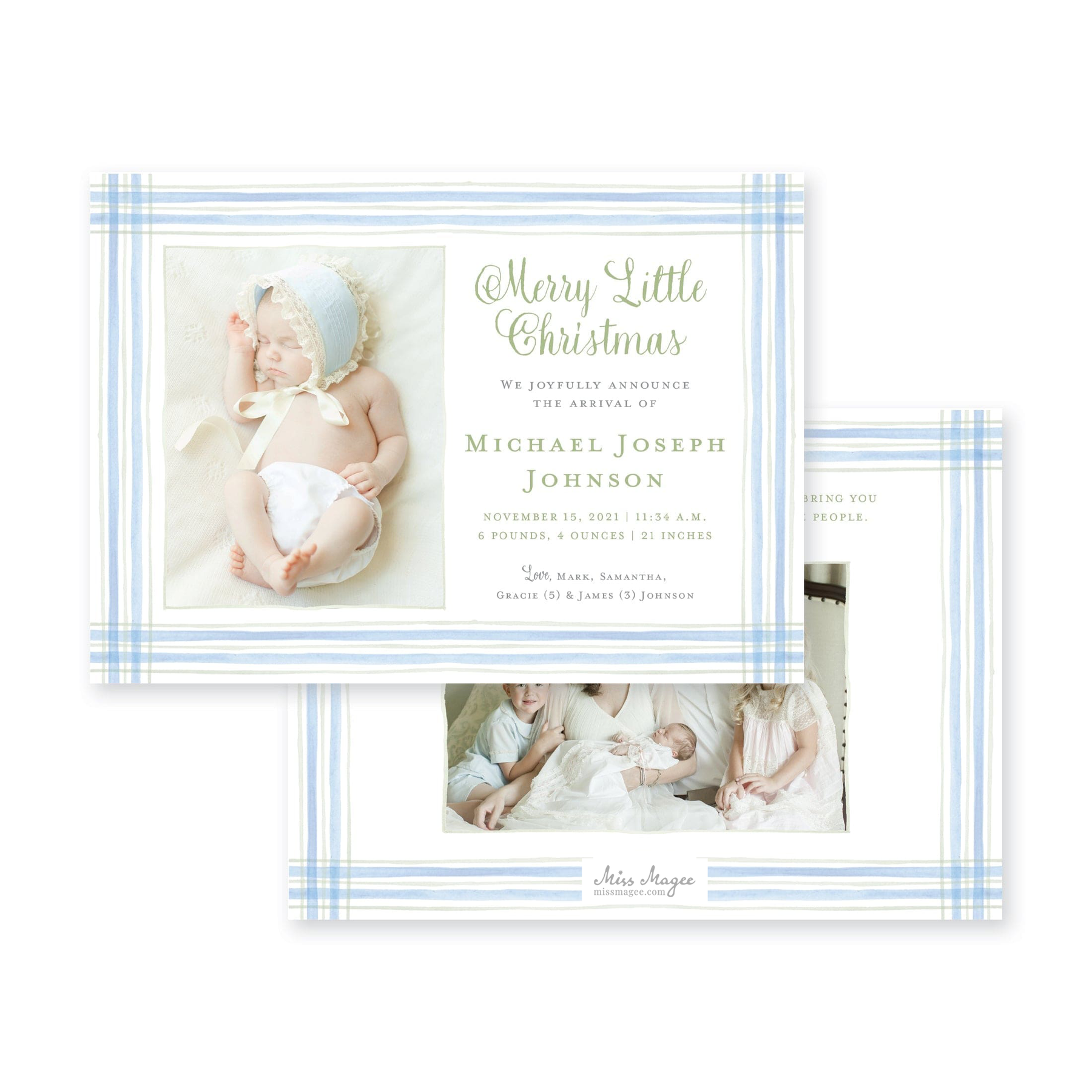 Watercolor Plaid Frame Announcement is the perfect birth announcement to send to your friends and family during the Christmas season. This features your photo on the front. You can add 1-3 photos on the back.