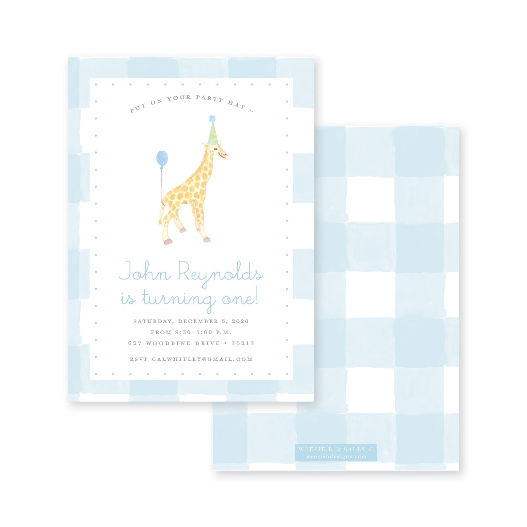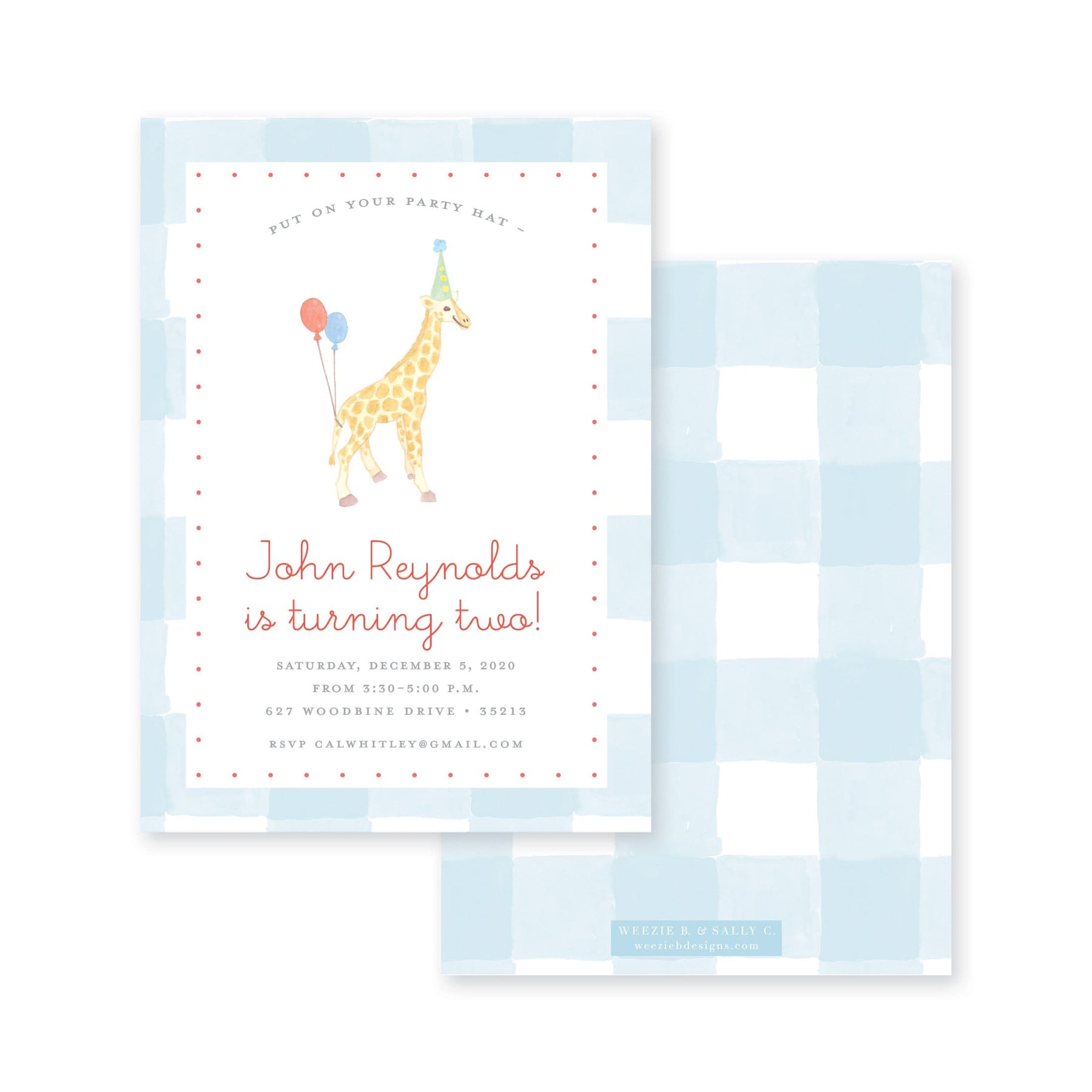 Put on you party hat! This adorable birthday party invitation for animal and party lovers alike! This watercolor giraffe in a party hats and with balloon/s is super cute and festive!