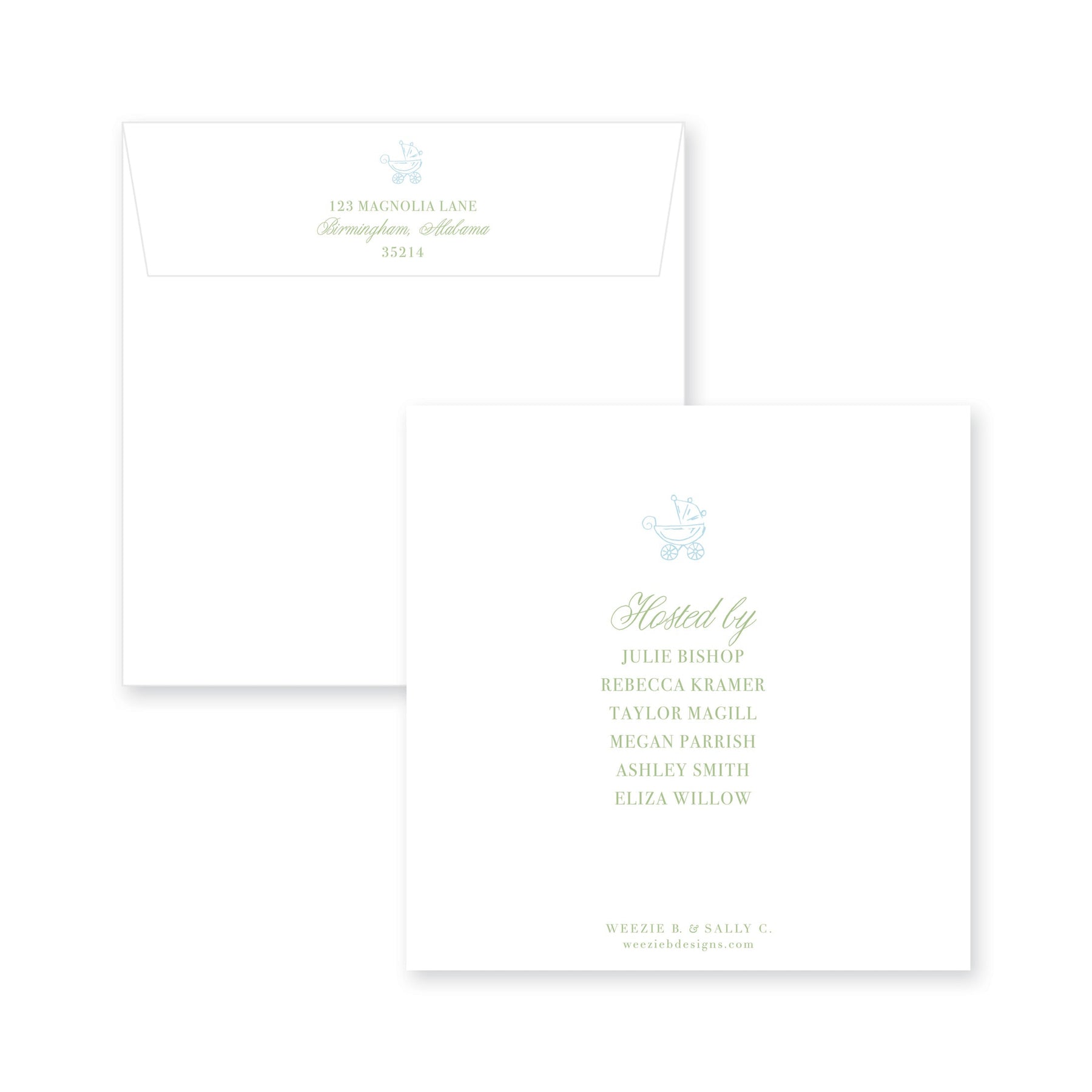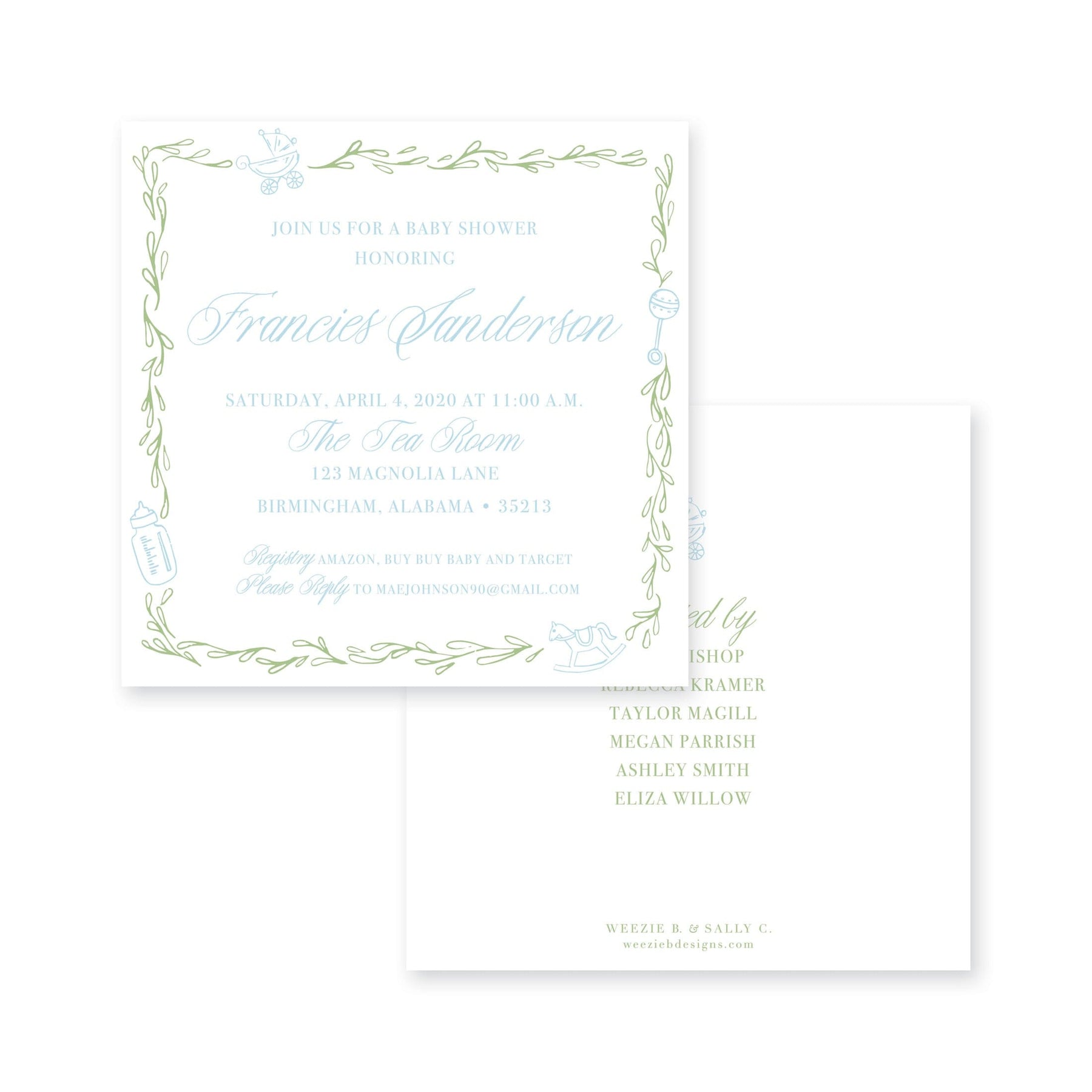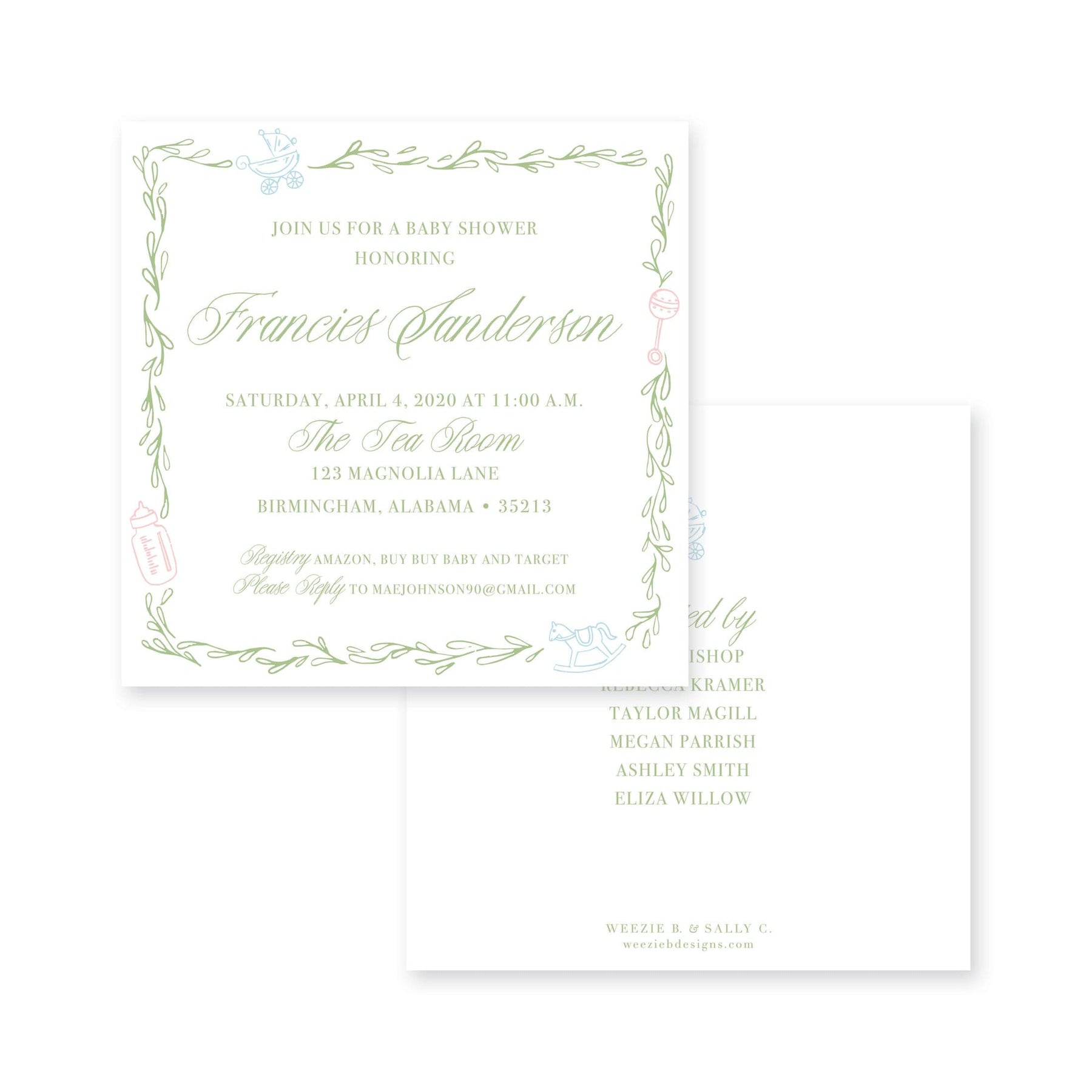 Our Baby Wreath Baby Shower Invitation is simply, timeless and adorable. Choose light pink, light blue or gender neutral green for this gorgeous shower.