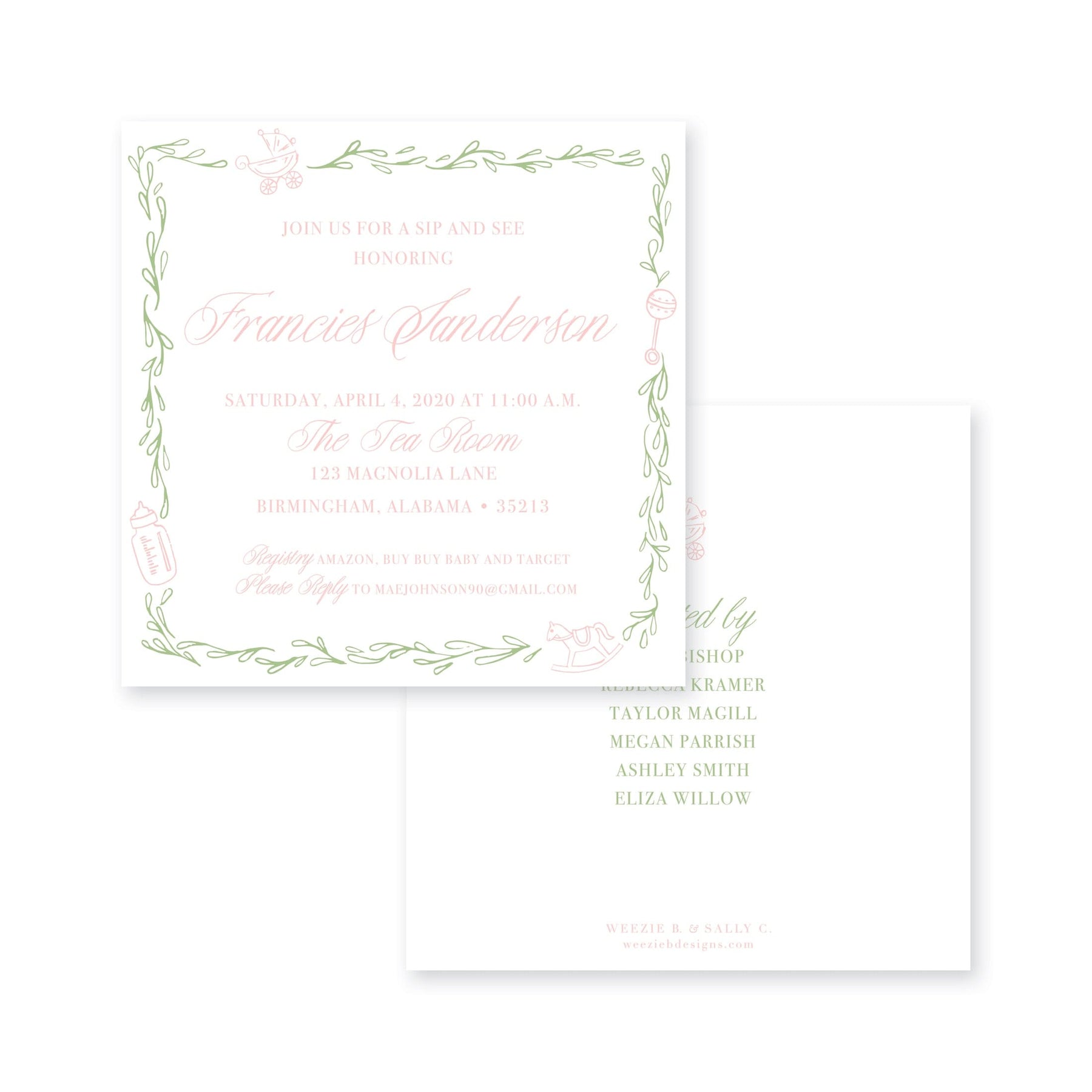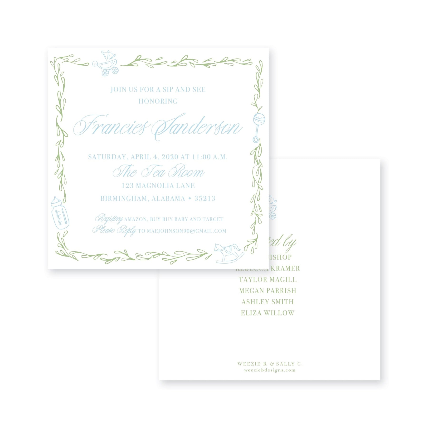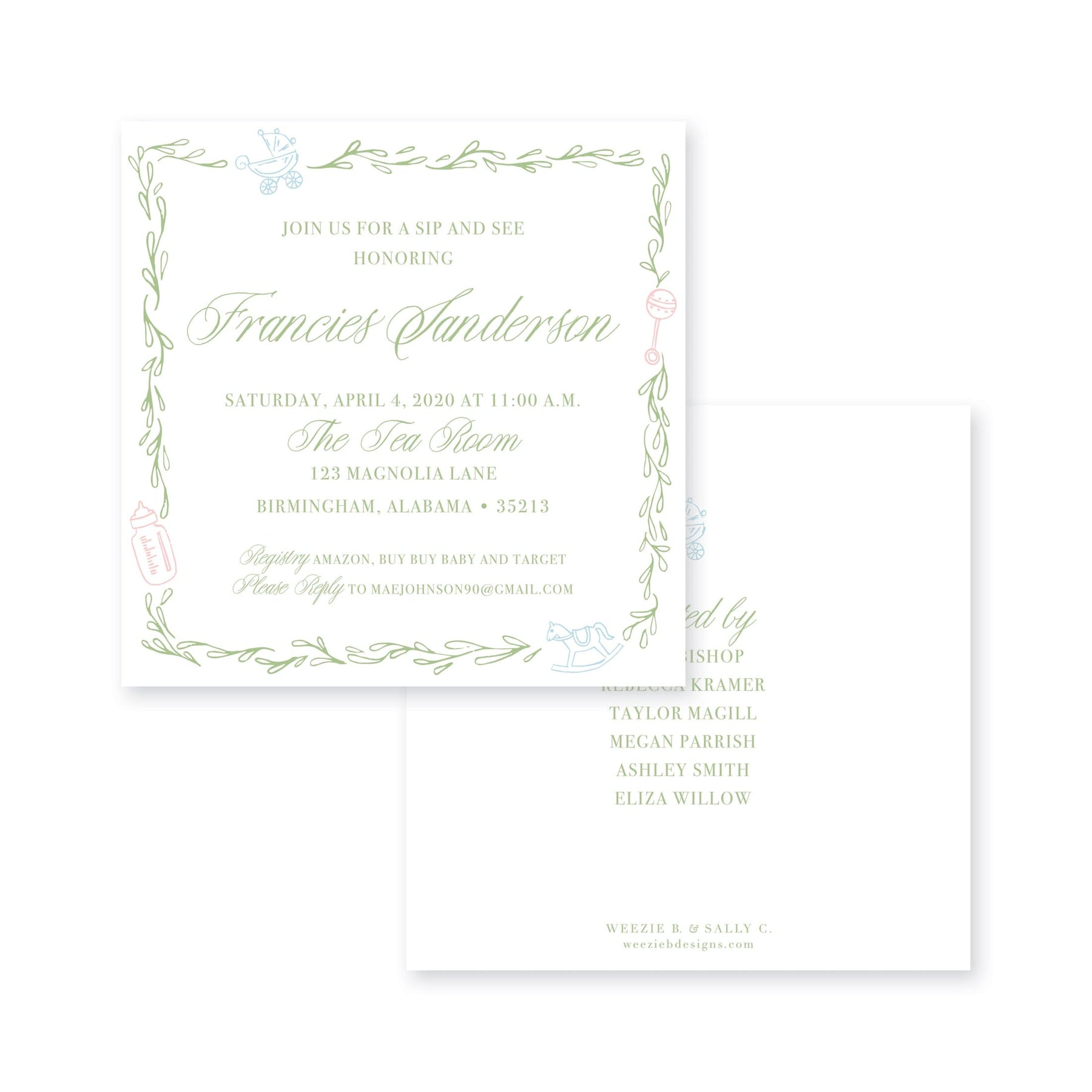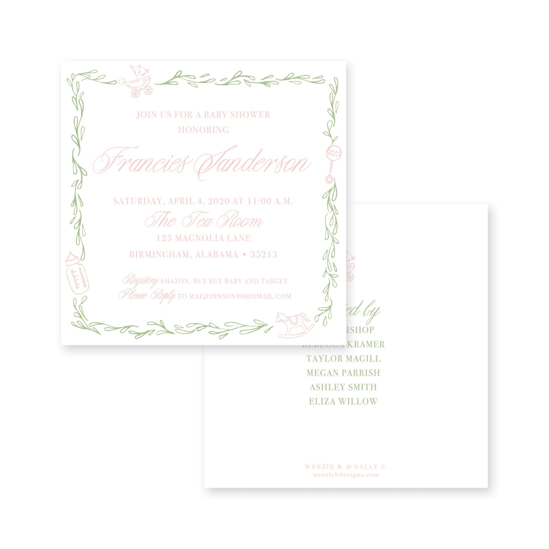 Our Baby Wreath Baby Shower Invitation is simply, timeless and adorable. Choose light pink, light blue or gender neutral green for this gorgeous shower.