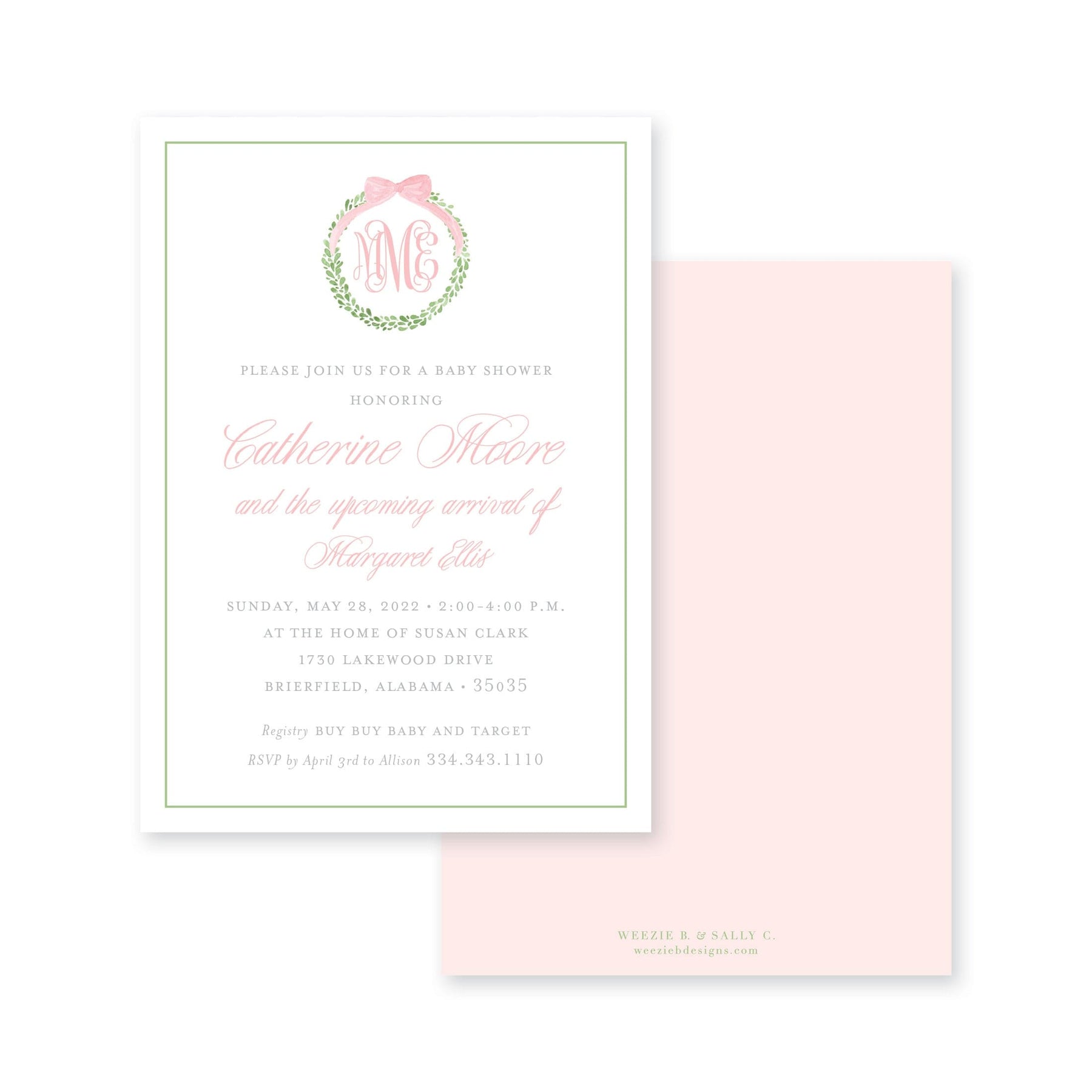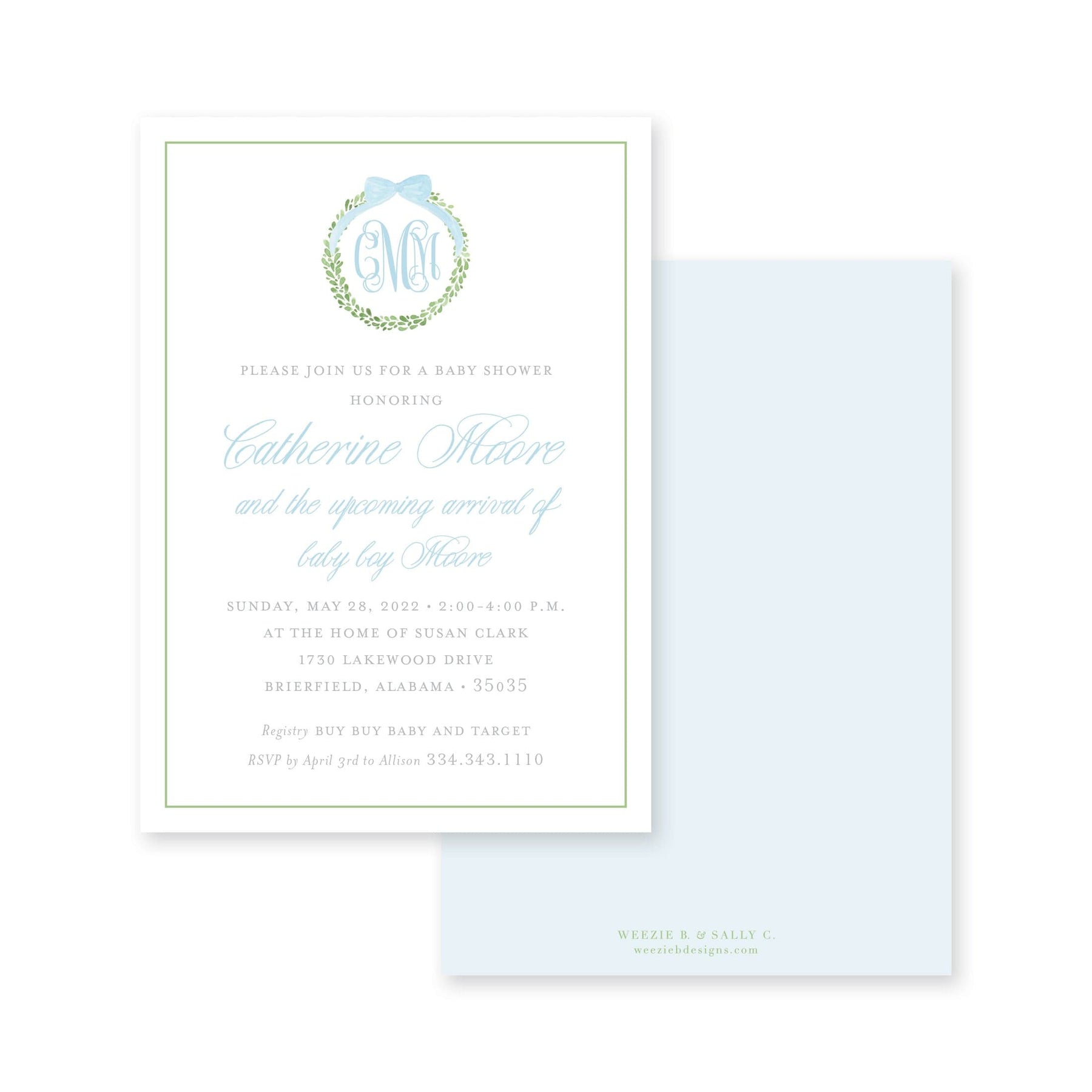 Simple and classic but sweet this Boxwood Wreath Baby Shower Invitation will be a perfect way to spread the word about your upcoming event! If you don't know the new baby's name, you can use the last name initial for the monogram in the wreath or the Mom-to-be's monogram, as shown on the blue image.