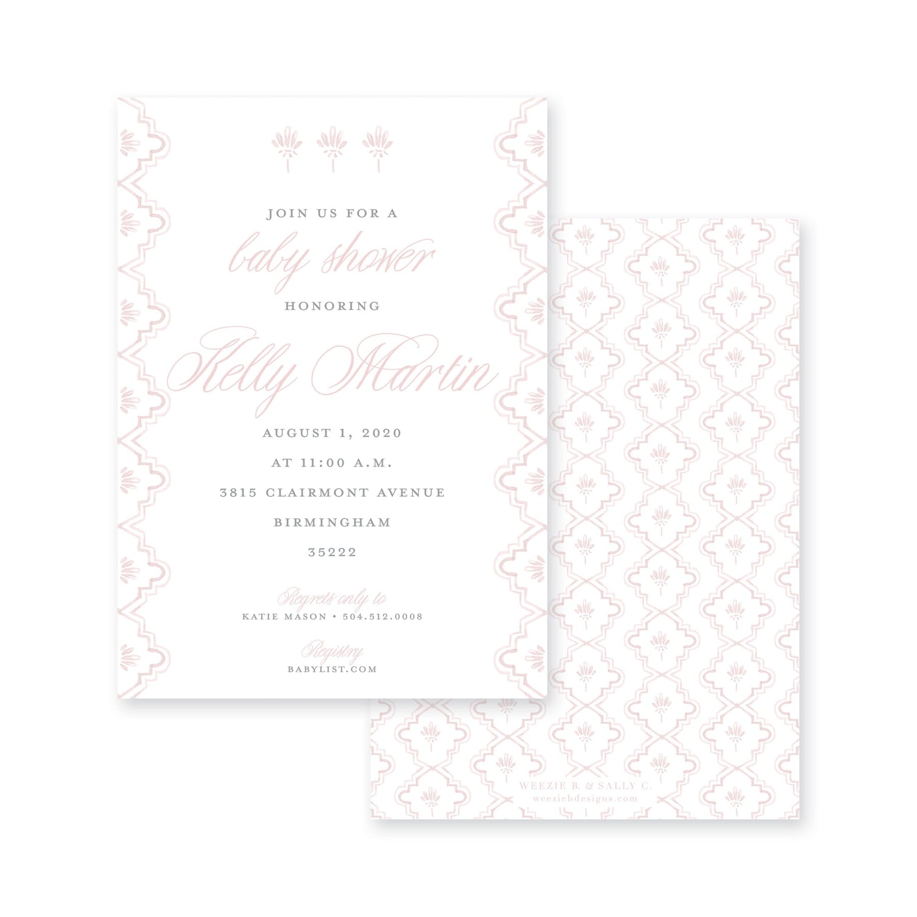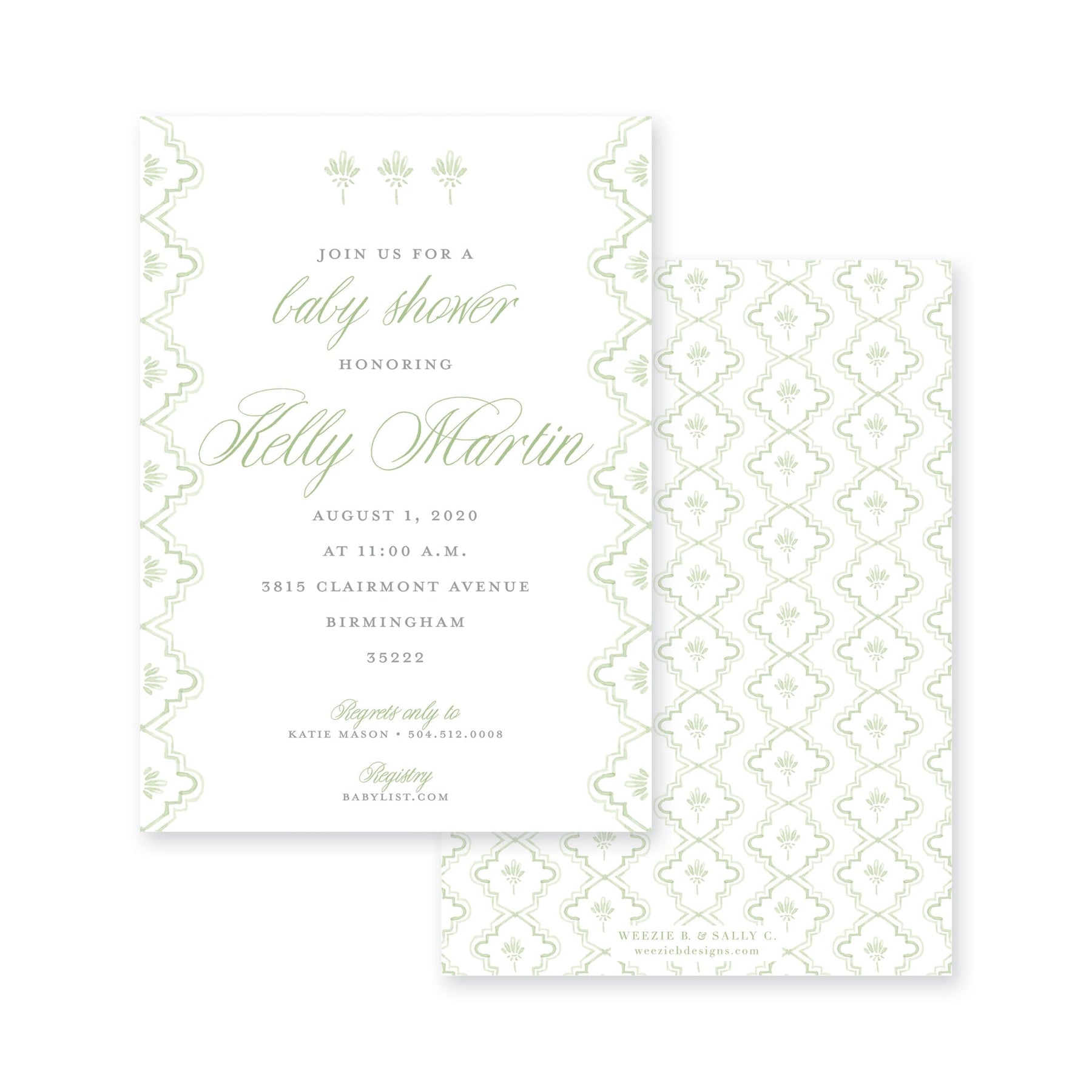 Chantilly Lace Baby Shower or Sip & See Invitation is really sweet and timeless! In baby blue, pink or neutral green this invitation will invite your friends and family to celebrate your baby with style.