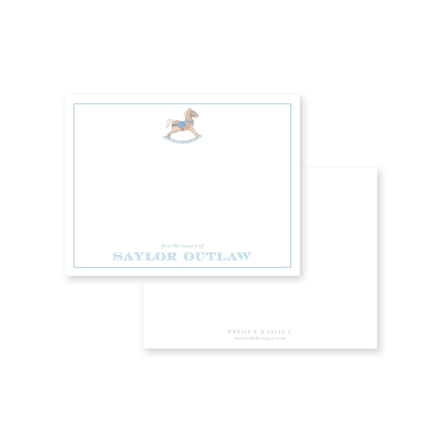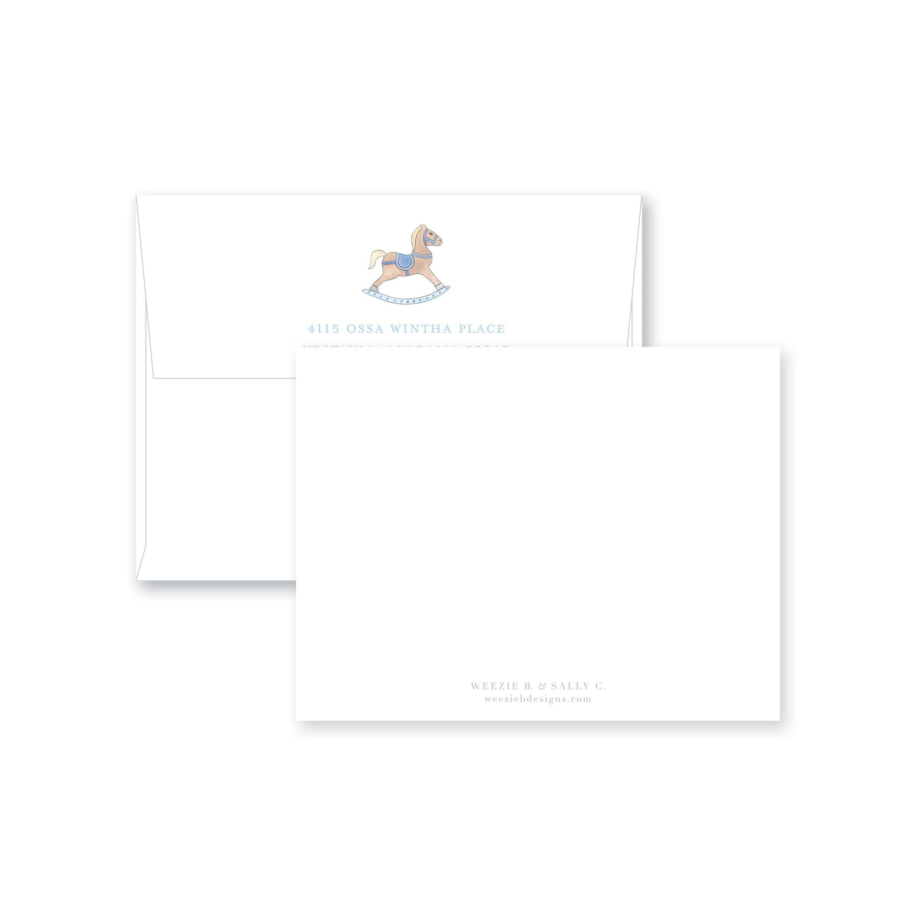 Watercolor Rocking Horse Flat Note Cards feature is so sweet and perfect for your little ones! They'll be pretty for thank you notes or any type of note!