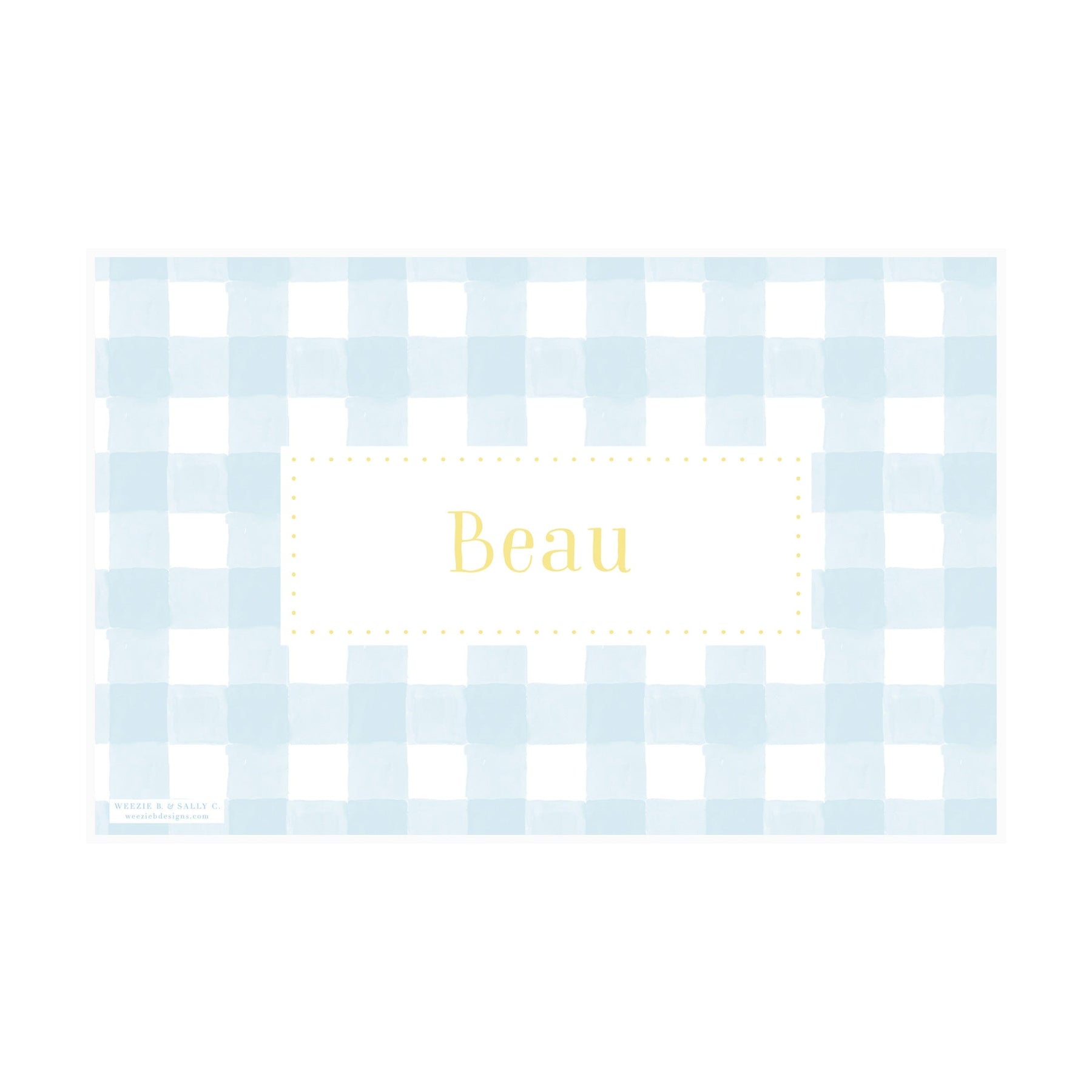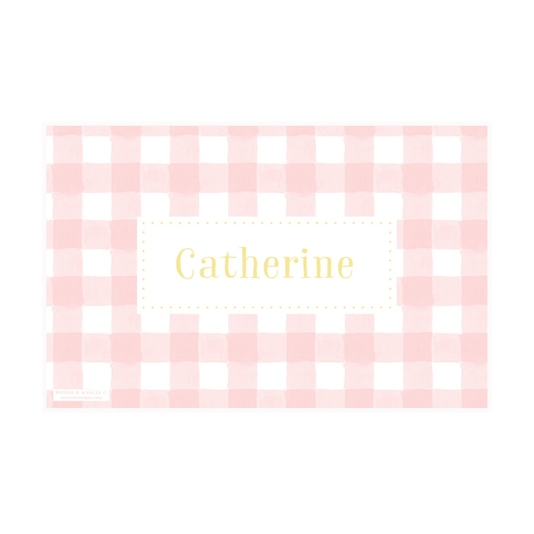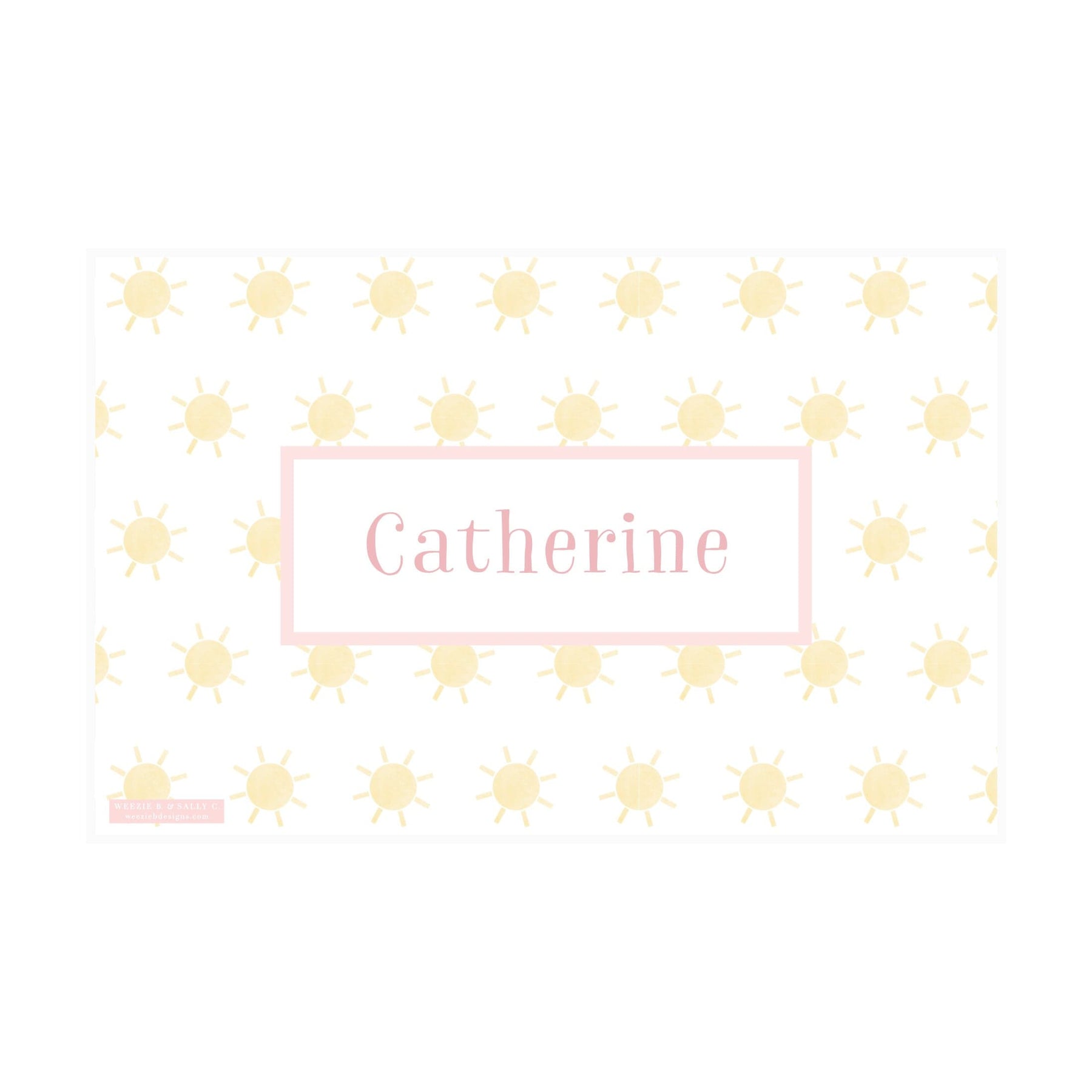 Sunshine Laminated Place Mat makes a sweet addition to your table. Your little ones will love helping set the table- and you'll be happy to keep your table a little less messy. The other side features our fun swimsuit pattern for girls and for boys with your little ones name in a box in the middle. These Place Mats are laminated so you can wipe and reuse. These personalized place mats make a great and usable gift for any occasion!