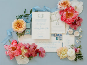 I have designed a curated collection of timeless designs using hand illustrations, paintings and other fine art techniques for our brides to choose from based on their unique style and wedding dreams. Once a favorite design has been selected, I work with you to make it just right. I know that every bride is different, so every bride is offered different ways to make each suite custom to fit their unique style. Miss Magee brides have the option to use the suite as is, (includes invitation, response card & envelope or insert and printed return envelope) or customize it (change font color, font, wording layout, graphic, add custom monogram, crest, venue, etc).