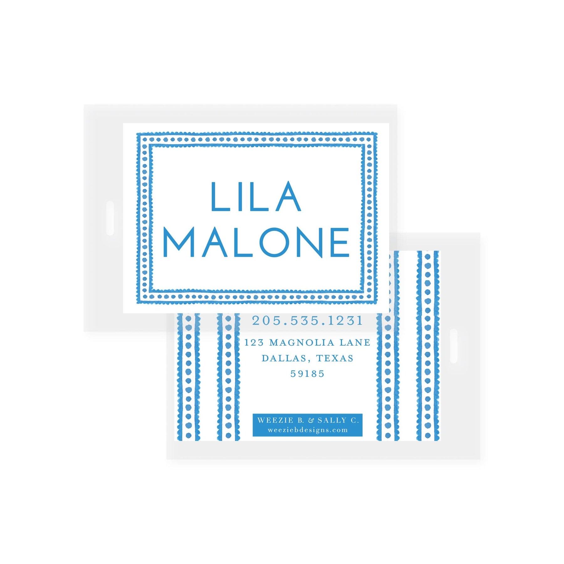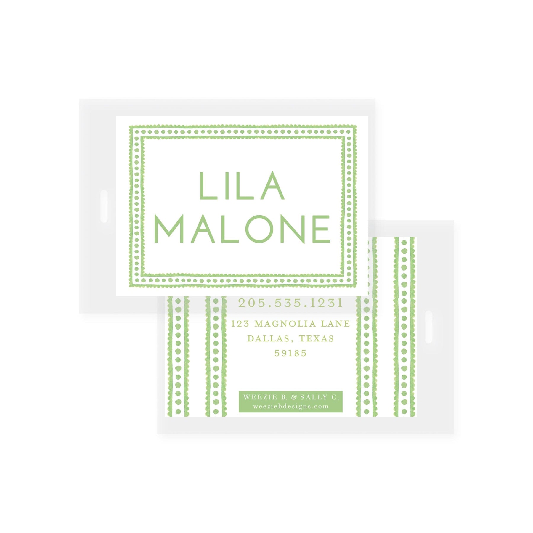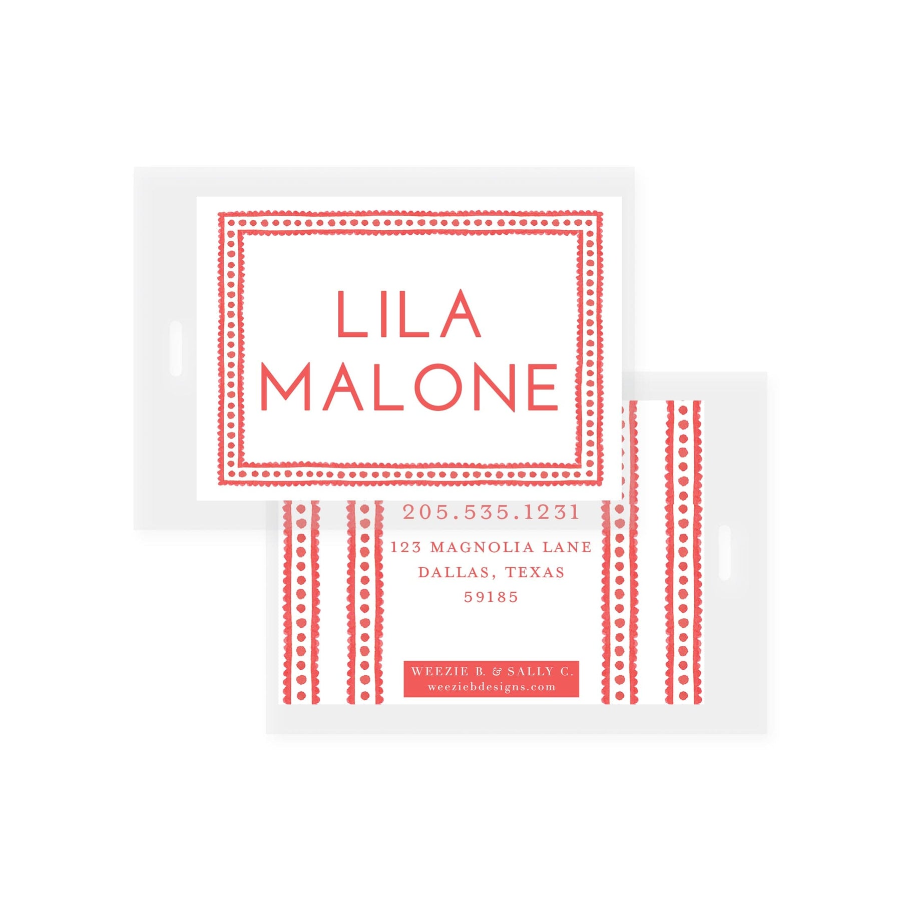 Features Personalized name or monogram with contact information on the back. A plastic ring to attached Bag Tag to object.