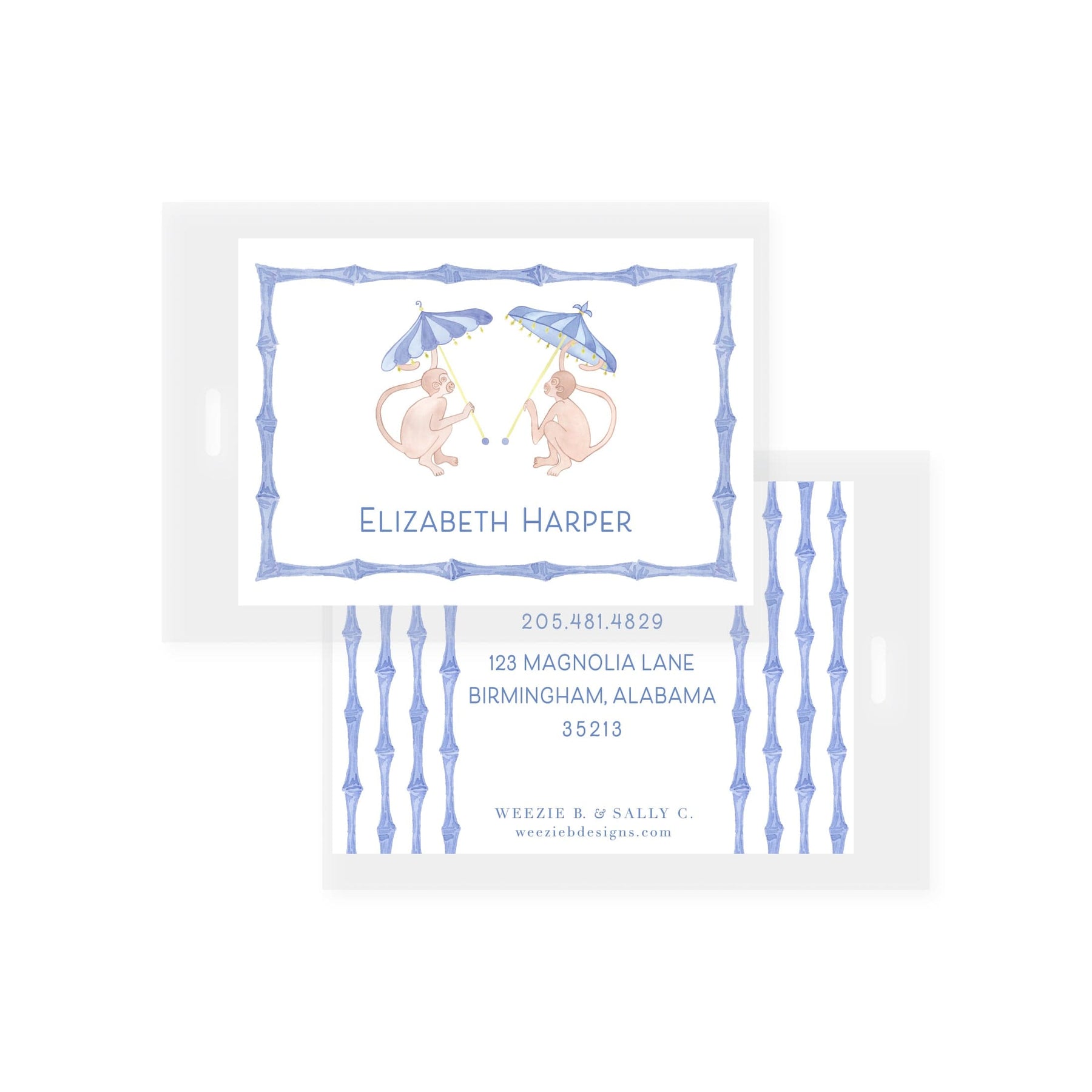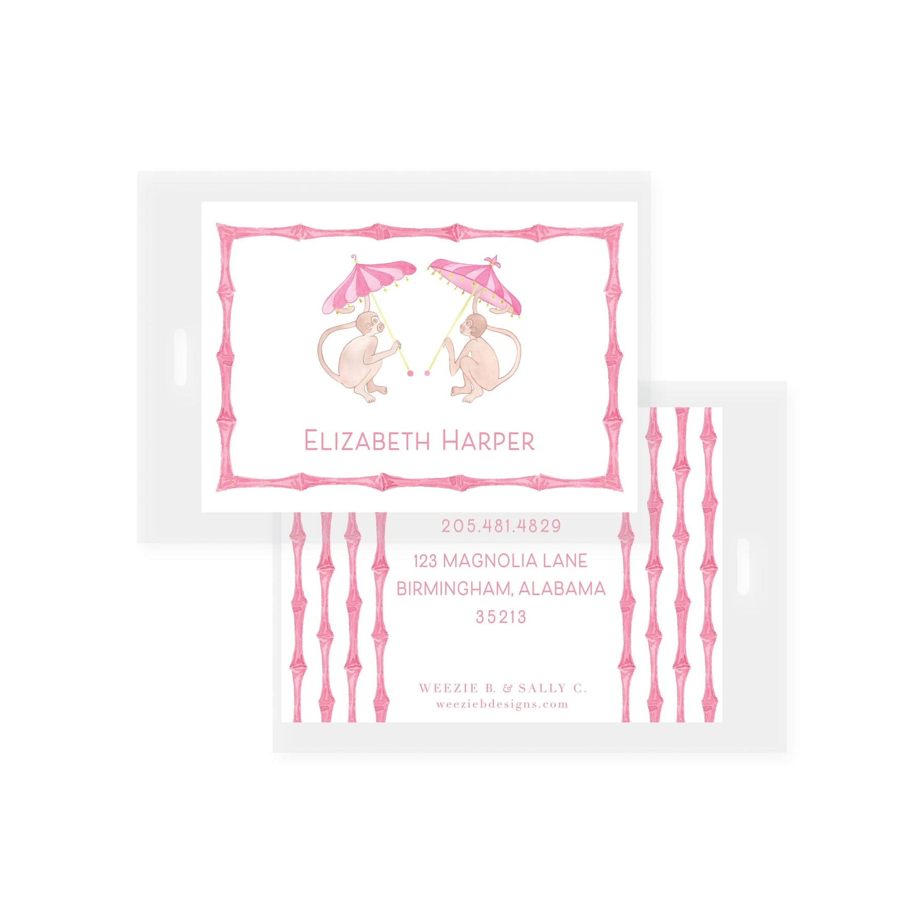 Features Personalized name or monogram with contact information on the back. A plastic ring to attached Bag Tag to object.